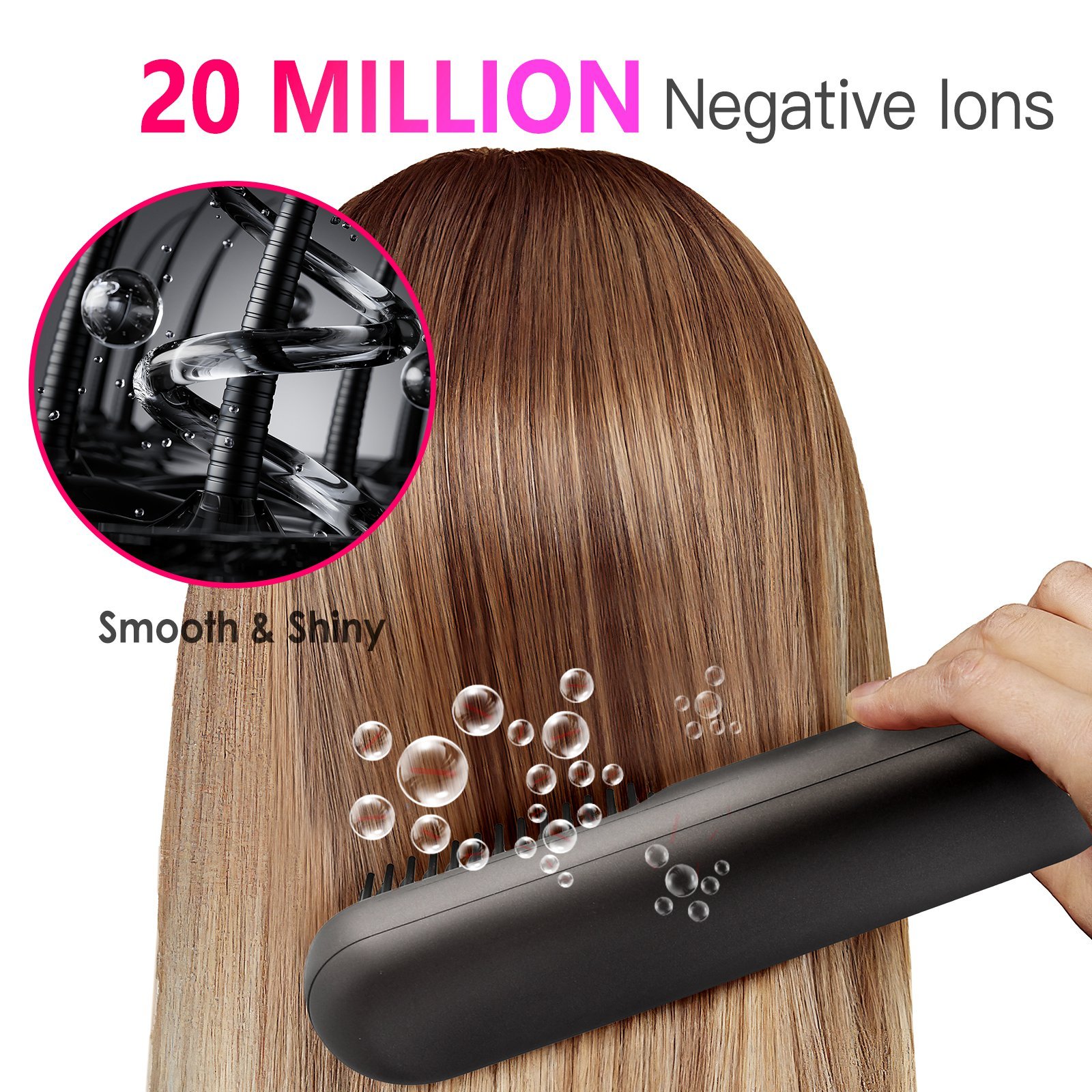 - *20 Million Negative Ions Care*: The hair straightener brush releases 20 million negative ions evenly distributed along each bristle,which not only gently soothes hair static and frizz,but also form a water film on the hair to reduce moisture loss after styling. Glide through hair effortlessly,preventing damage and leaving it smooth and polished.